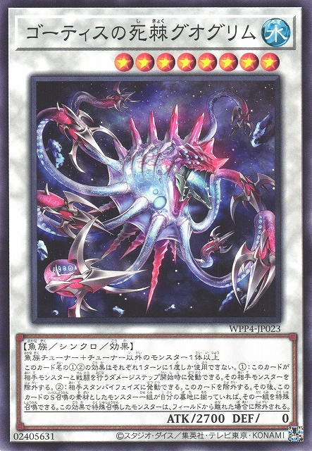WPP4-JP023 ゴーティスの死棘グオグリム (異魚死棘 格奧格里姆) 同步/效果怪獸 8 水 魚族 2700/0 魚族協調+協調以外怪獸一體以上 此卡名的①②效果一回合可以各用一次 ①:此卡和對方怪獸戰鬥的傷害步驟開始時可以發動。該對方怪獸除外 ②:對手準備階段可以發動。此卡除外。之後,若此卡S召喚的S素材怪獸一組全在我方墓地,可以將該組怪獸特殊召喚。此效果特殊召喚的怪獸離場的場合除外