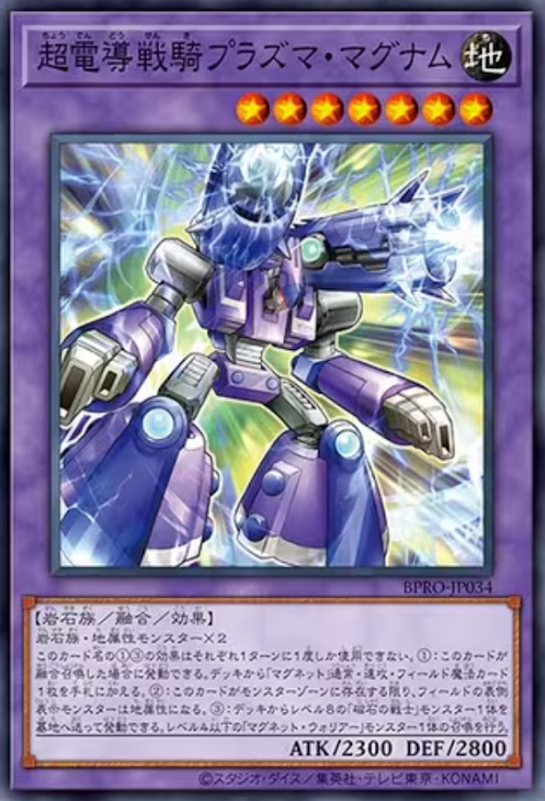 BPRO-JP034 (SR)超電導戦騎プラズマ・マグナム (超電導戰騎 電漿磁砲) 融合/效果怪獸 7 地 岩石族 2300/2800 岩石族˙地屬性怪獸X2 此卡名的①③效果一回合可以各用一次 ①:此卡融合召喚的場合可以發動。牌組「マグネット」通常˙速攻˙場地魔法卡1張加入手牌 ②:此卡在場上表側表示存在為限,場上表側表示怪獸變為地屬性 ③:將牌組等級8「磁石の戦士」怪獸1體送墓可以發動。召喚1體等級4以下「マグネット・ウォリアー」怪獸