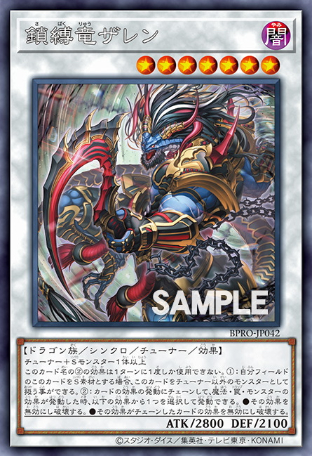 BPRO-JP042 (R)鎖縛竜ザレン (鎖縛龍 賽連) 協調/同步/效果怪獸 7 暗 龍族 2800/2100 協調+S怪獸一體以上 此卡名的②效果一回合只能使用一次 ①:我方場上此卡作為S素材的場合,此卡可以當作協調以外怪獸 ②:魔法˙陷阱˙怪獸效果連鎖卡片效果的發動來發動時,可以選擇以下1個效果發動 ●該效果無效並破壞 ●被連鎖該效果的卡效果無效並破壞