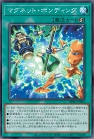 BPRO-JP053 マグネット・ボンディング (磁石結合) 速攻魔法 ①:雙方主要階段可以選擇以下一個效果發動(此卡名的以下效果一回合可以各選一次) ●「超電導戦士 リニア・マグナム±」或等級4以下「マグネット・ウォリアー」怪獸1體從牌組加入手牌 ●牌組等級8「磁石の戦士」怪獸1體加入手牌 ●將我方手牌˙場上˙墓地˙除外狀態岩石族怪獸作為融合素材回到牌組,將岩石族融合怪獸1體融合召喚