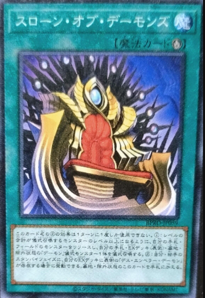 BPRO-JP059 スローン・オブ・デーモンズ (惡魔王座) 儀式魔法 此卡名的②效果一回合只能使用一次 ①:等級合計到要儀式召喚的怪獸等級以上為止,將我方手牌˙場上怪獸解放,將我方手牌˙EX牌組(表側)˙墓地˙除外狀態「デーモン」儀式怪獸1體儀式召喚 ②:雙方準備階段,我方EX牌組有表側表示「デス・エンペラー・デーモン」存在的場合可以發動。墓地˙除外狀態此卡加入手牌