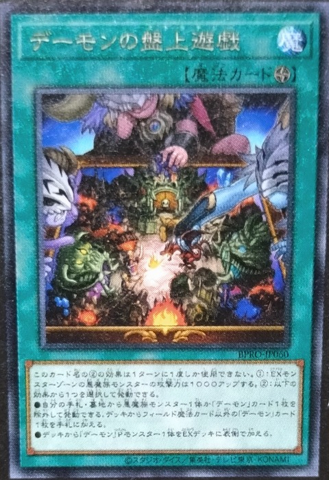 BPRO-JP060 (R)デーモンの盤上遊戯 (惡魔的盤上遊戲) 場地魔法 此卡名的②效果一回合只能使用一次 ①:EX怪獸區惡魔族怪獸攻擊力上升1000 ②:可以選擇以下一個效果發動 ●將我方手牌˙墓地惡魔族怪獸1體或「デーモン」卡1張除外可以發動。牌組場地魔法卡以外「デーモン」卡1張加入手牌 ●牌組「デーモン」P怪獸1體表側表示加入EX牌組