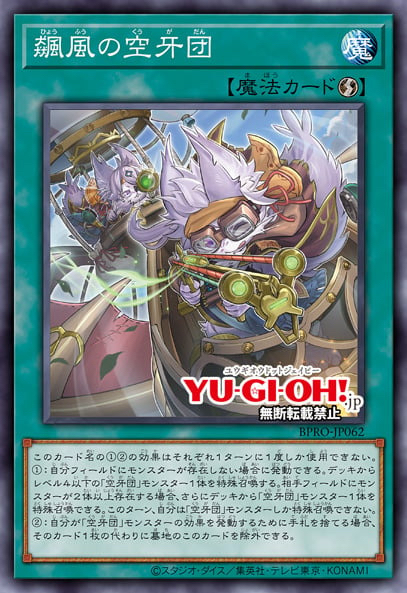 BPRO-JP062 飆風の空牙団 (飆風的空牙團) 速攻魔法 此卡名的①②效果一回合可以各用一次 ①:我方場上沒有怪獸存在的場合可以發動。牌組等級4以下「空牙団」怪獸1體特殊召喚。對方場上存在2體以上怪獸的場合,可以再將牌組「空牙団」怪獸1體特殊召喚。這回合,我方只能特殊召喚「空牙団」怪獸 ②:我方為了發動「空牙団」怪獸效果要捨棄手牌的場合,作為其中1張的代替可以將墓地此卡除外