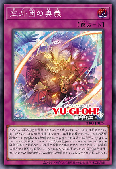 BPRO-JP075 空牙団の奥義 (空牙團的奧義) 通常陷阱 此卡名的①②效果一回合只能選擇一個使用一次 ①:以最多為我方場上「空牙団」怪獸種類數量的場上表側表示卡片為對象可以發動。那些卡破壞。我方場上有等級8以上及L3以上「空牙団」怪獸存在的場合,作為代替可以將對象卡片全部除外 ②:此卡在墓地存在的狀態,我方場上等級8以上或L3以上「空牙団」怪獸特殊召喚的場合可以發動。此卡加入手牌