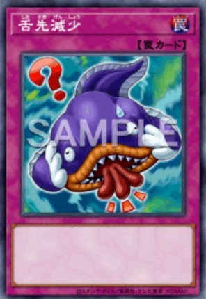 BPRO-JP079 舌先減少 (舌先減少) 通常陷阱 ①:對手發動要宣言1個卡名來發動的效果時可以發動。該效果無效。之後,我方可以將宣言卡片1張從牌組加入手牌 ②:覆蓋的此卡被對方效果破壞的場合,以對方場上表側表示怪獸1體為對象可以發動。該怪獸攻擊力下降500